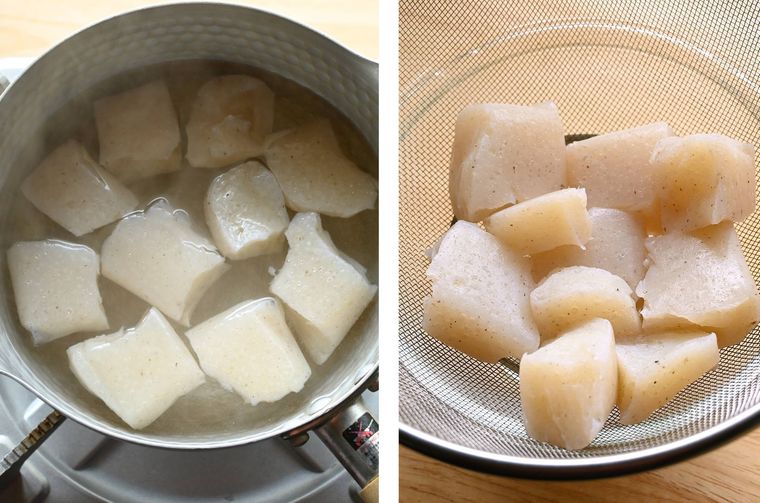 鍋にこんにゃくとかぶるくらいの水を入れて火にかけ、アクを抜きをします。沸騰して1~2分煮たらざるにあげて水気を切ります。