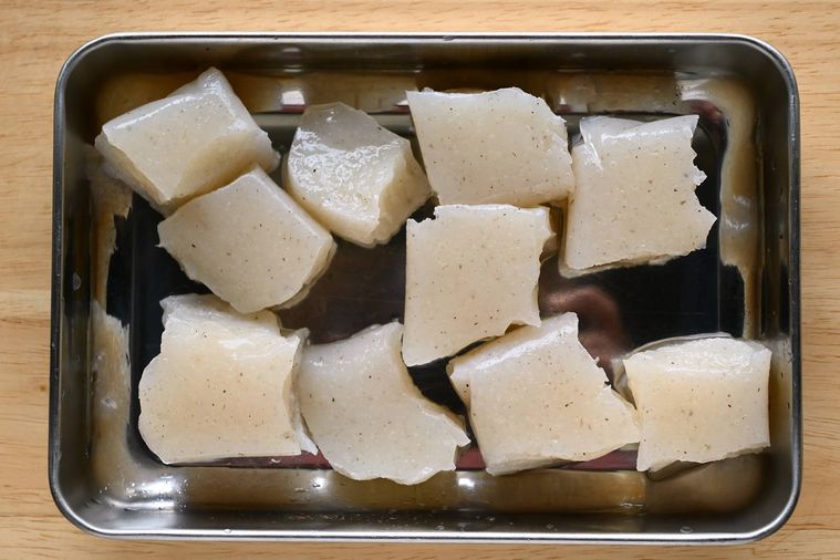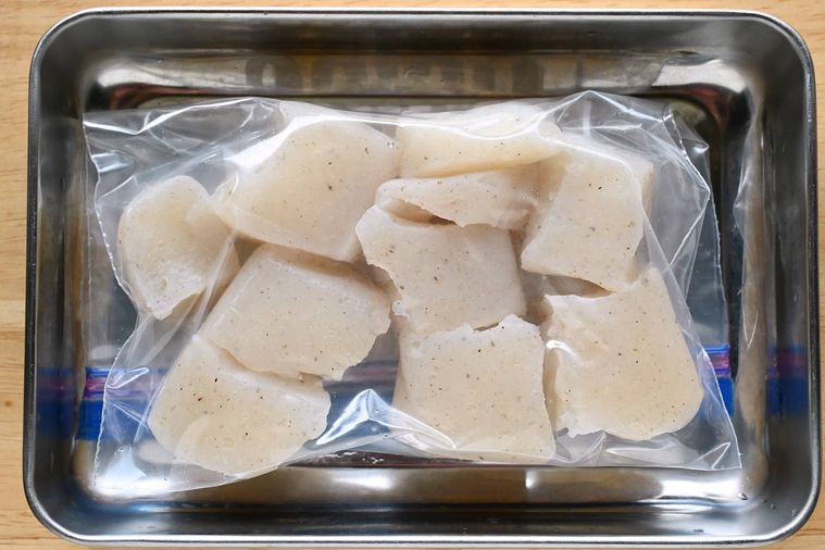 こんにゃくが冷めたらフリーザーバッグに入れ、冷凍庫でひと晩凍らせます。