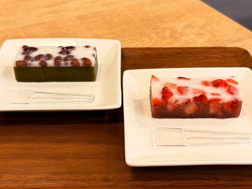 しっとりとしたこしあんの水ようかんと、ぷるんとした練乳ゼリーのまろやかな甘みがじんわりと広がる上品な甘さです。いちごがゴロゴロ入っており、冷凍されたいちごのしゃりしゃりとしたフルーツ感も魅力。甘酸っぱさがやさしく広がる味わいでした。