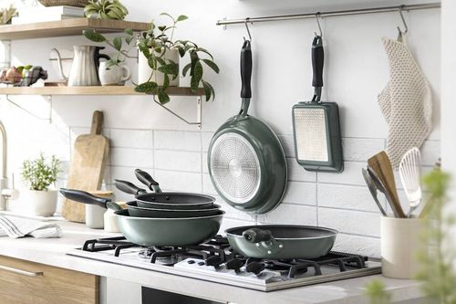キッチンや用途に合わせて選べる、13cmの玉子焼き用から28cmの深型まで、豊富なサイズ展開も魅力。カラーは“GREEN”の名のとおり、自然をイメージした落ち着いたグリーンで、機能性だけでなくインテリア性も兼ね備えています。キッチンを彩るアクセントとして取り入れやすく、IHやガスなど、あらゆる熱源に対応しているのも嬉しいポイントです。