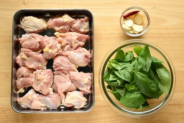 鶏肉は余分な皮と脂肪を取り除き、大きめの一口大に切ります。赤唐辛子はへたと種を取り除き、にんにくとしょうがは薄切りにします。バジルは軸から葉を摘み取ります。