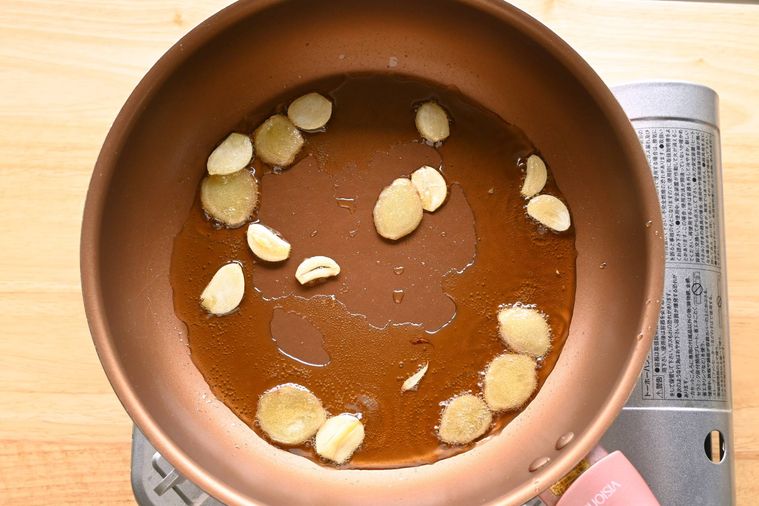 フライパンにごま油をひき、にんにくとしょうがを加えて中火にかけます。