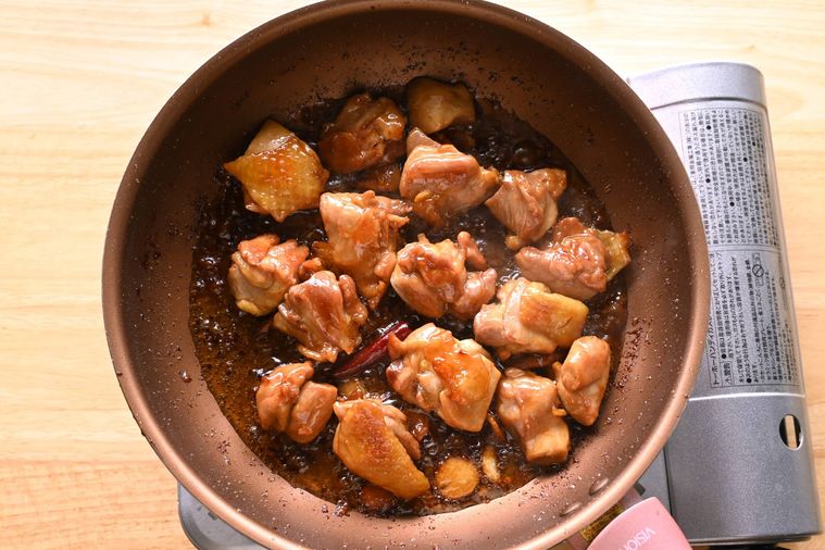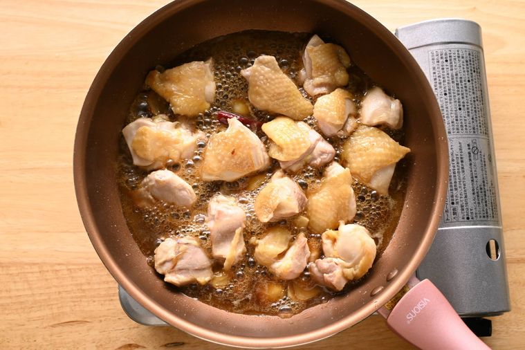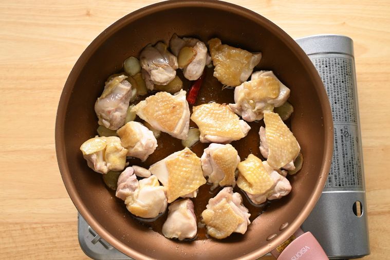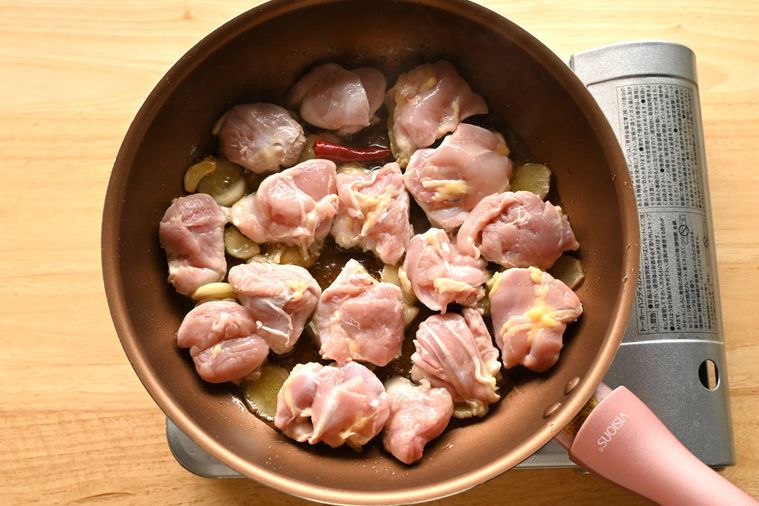 にんにくとしょうがの良い香りが立ったら赤唐辛子を加え、鶏肉を皮目を下にして並べ入れます。