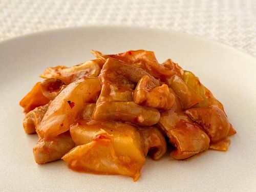 まろやかなコチュジャンのコクがしっとりと広がり、ピリッとした辛さがアクセントになっています。メインの牛ホルモンはむっちりとした弾力としっとりとした肉質が楽しめ、甘辛い味付けと相性抜群。