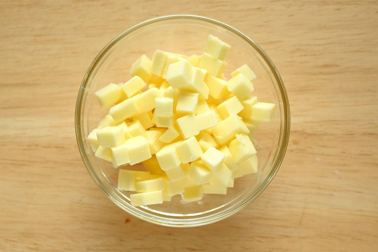 バターはさいの目切りにし、作業直前まで冷蔵庫に入れて冷やしておきます。卵と牛乳をよく混ぜ、卵液を作ります。オーブンは180℃で予熱します。