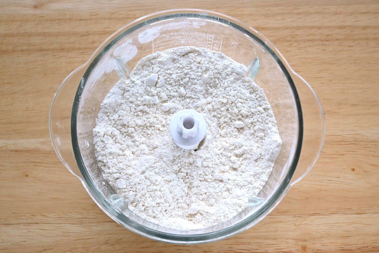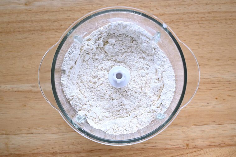 薄力粉と強力粉、ベーキングパウダーをフードプロセッサーに入れて攪拌します。