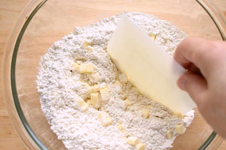 ボウルに粉類を入れてザッと混ぜ、冷やしておいたバターを加えます。カードでバターを刻みながら粉をまとわせます。