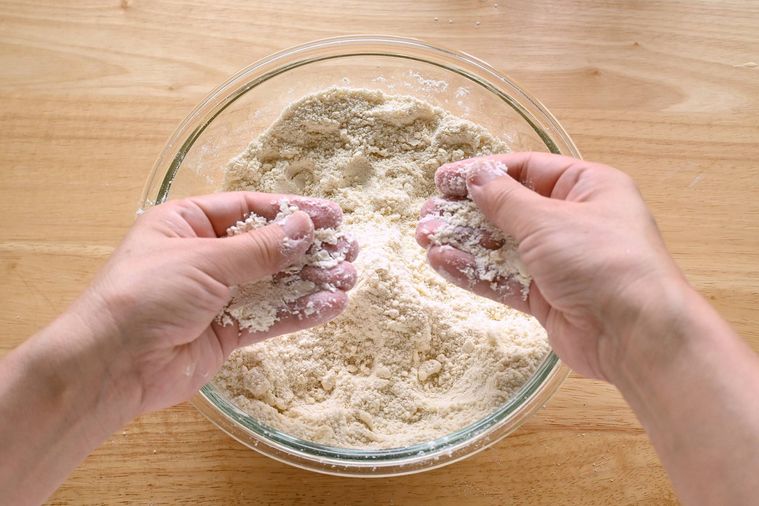 バターの塊が目立たなくなったら、両手の指先で粉とバターをすり合わせます。手の熱でバターが溶けてしまわないよう手早く行います。気温の高い時期は手を冷水などで冷やしてから作業するのもおすすめ。サラサラとした砂状になればOKです。