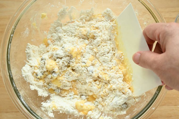 カードで底から上下を返すようにさっくりと混ぜ、粉に水分を行きわたらせます。