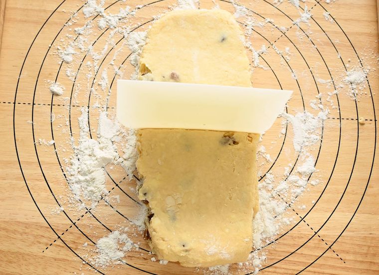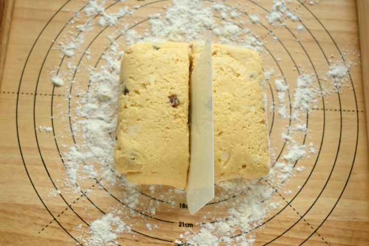 打ち粉(強力粉:分量外)を振った台に生地をのせ、カードで半分にカットします。