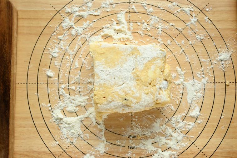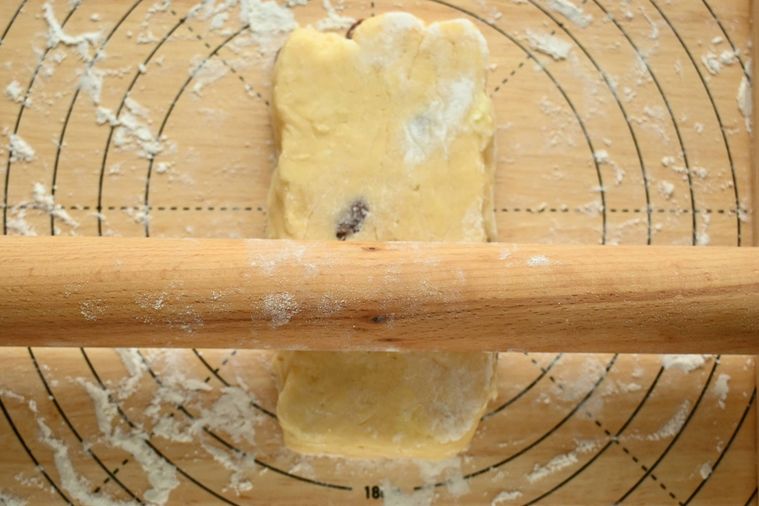 同じように生地を重ねます。再度麺棒で厚さ2cmにのばします。