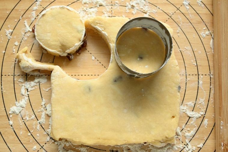 残りの生地を集めて縦長にのばし、2個型抜きします。余った生地は手でまとめます。