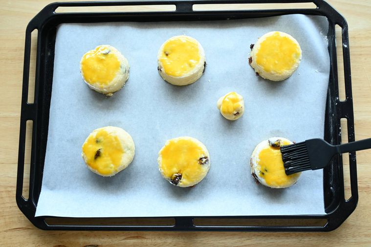 クッキングシートをしいた天板に生地をのせ、表面に卵黄を塗ります。