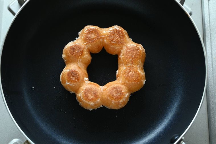 フライパンにポン・デ・リングを入れ、両面にほどよい焼き色が付くまで弱火で焼きます。