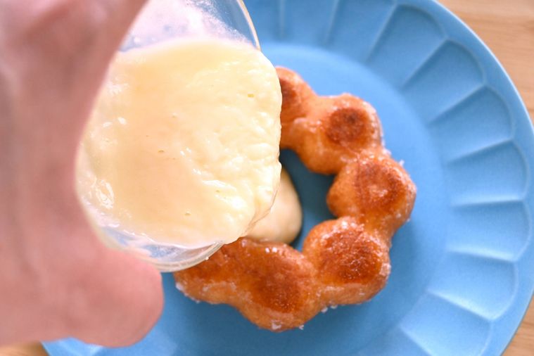 3.ポン・デ・リングの空洞にチーズソースを注ぐ