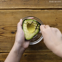 アボカドを1cm角の格子状に切り込みを入れ、スプーンで取り出します。