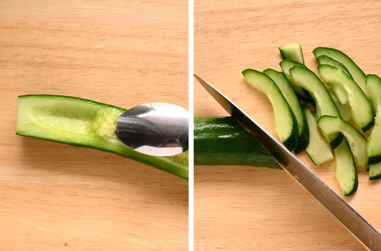 きゅうりは両端を切り落として縦半分に切り、スプーンを使って種をこそぎ取ります。切り口を下にして斜め薄切りにします。