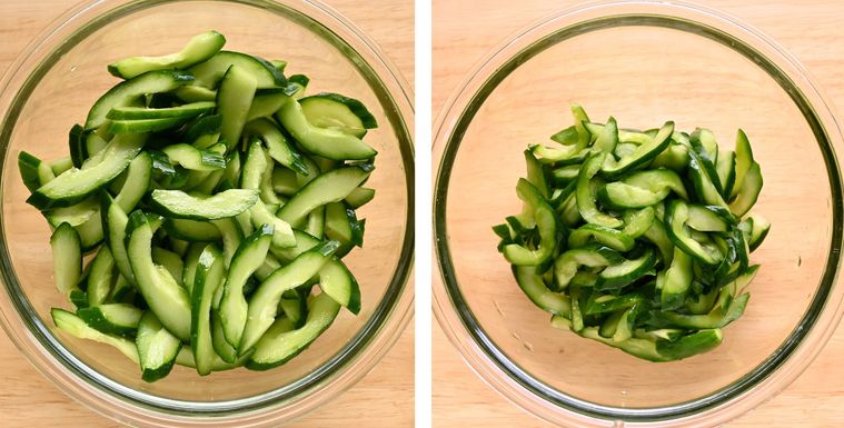 きゅうりに塩を振って全体になじませます。5分ほどおいたらギュッと絞って水気を切ります。
