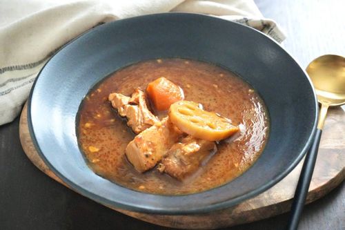 器に出してみると具材がゴロゴロと大きく、「これぞスープカレー!」と見た目にも気分が上がります。筆者の食べたものは、大きな鶏もも肉が3切れ、立派なれんこんにごろっと大きなにんじんが入っていました。