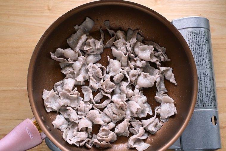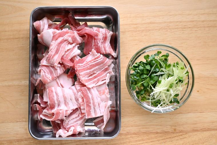 豚バラ肉は3~4cm幅に切り、かいわれ大根は長さを半分に切ります。