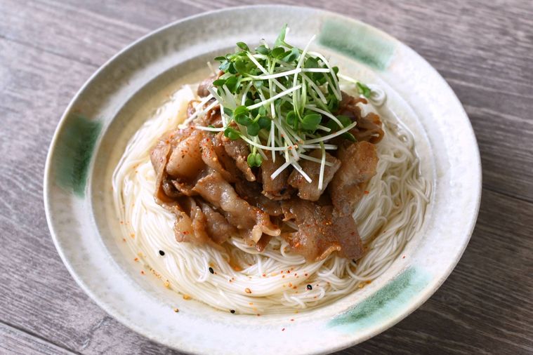 冷たいそうめんだけだと物足りない…という方におすすめの、食べ応えバッチリなひと品。甘辛いタレでしっかり味付けされた豚バラ肉が加わることで、大満足のボリュームに。ジューシーな豚肉の旨みがそうめんに絡み、箸が止まらなくなりますよ。