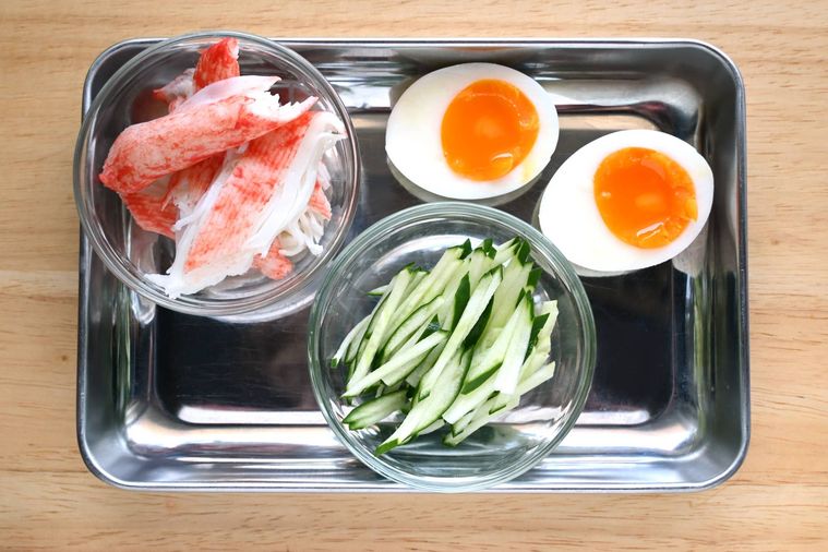 きゅうりは斜め薄切りにしてから細切りに、カニ風味かまぼこは軽くほぐします。半熟卵は半分に切ります。