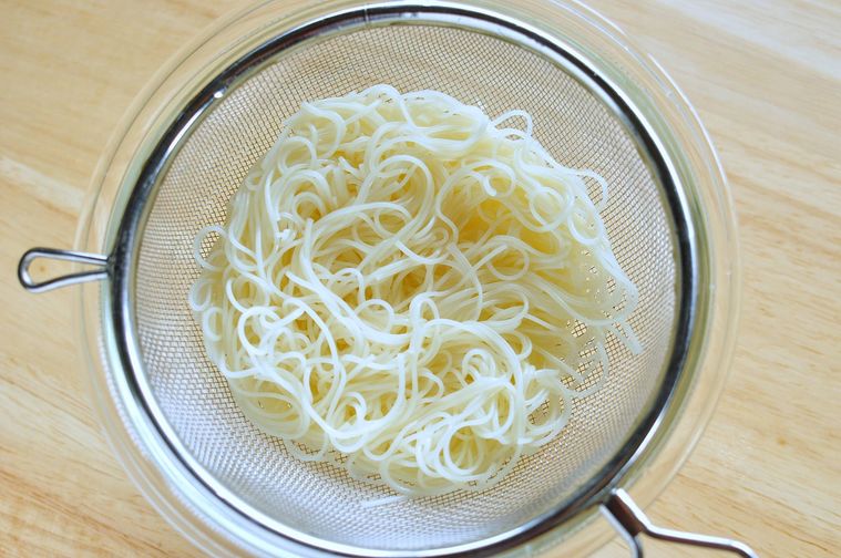 そうめんをゆでて氷水で締め、ザルにあげて水気を切ります。