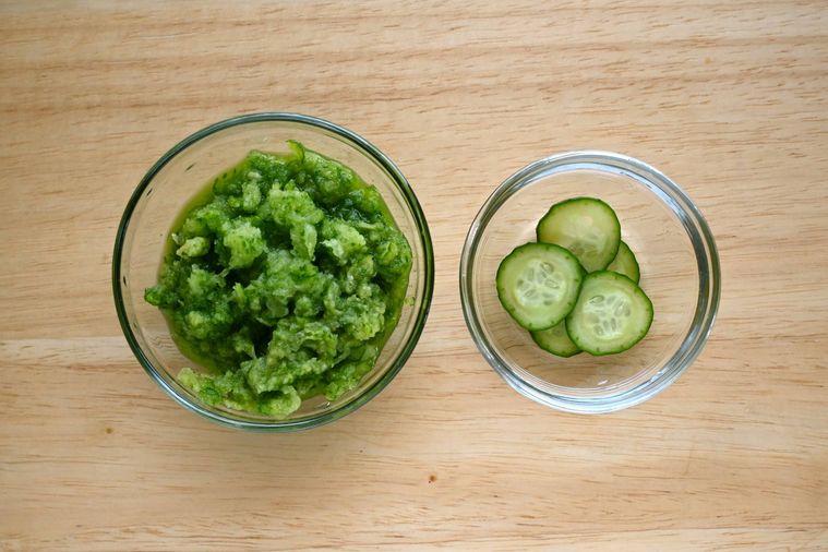 きゅうりは両端を切り落とし、トッピング用に数枚輪切りにして取り置きます。残りはすりおろして塩を振り、なじませておきます。