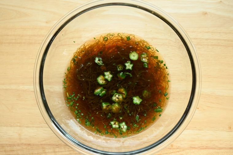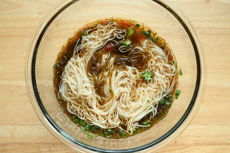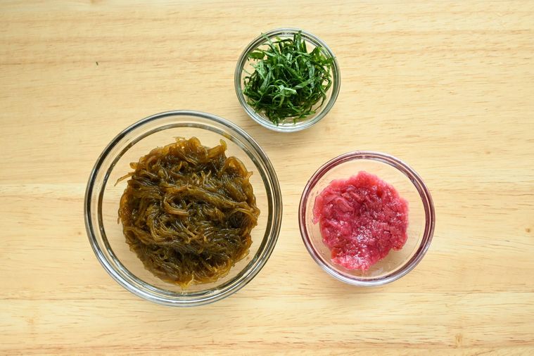 - もずくとそうめんの水切りはしっかりと。水気が残っていると味がぼやけてしまいます。