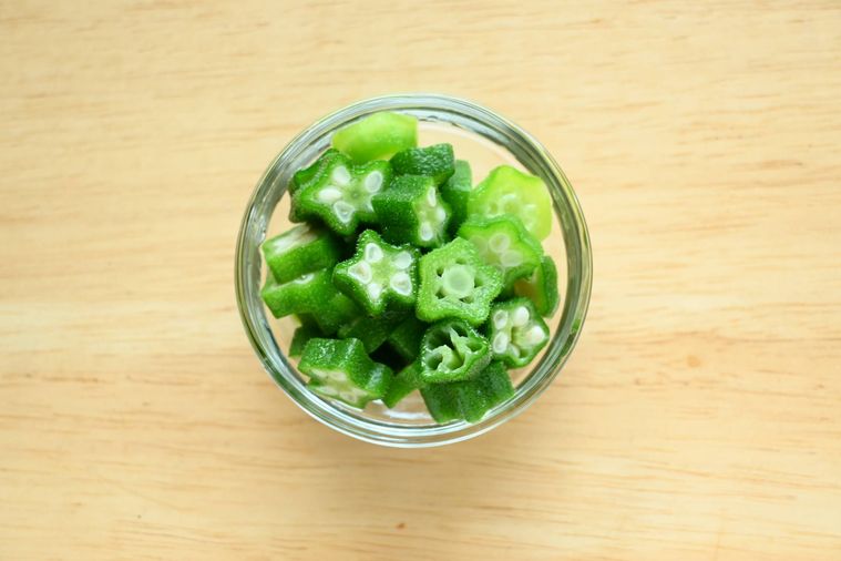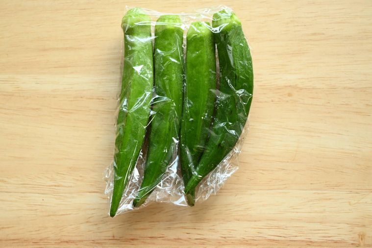オクラを塩適量(分量外)で板ずりし、ガクとヘタの硬い部分を取り除きます。切り込みを入れてラップで包み、レンジ600Wで50秒加熱します。