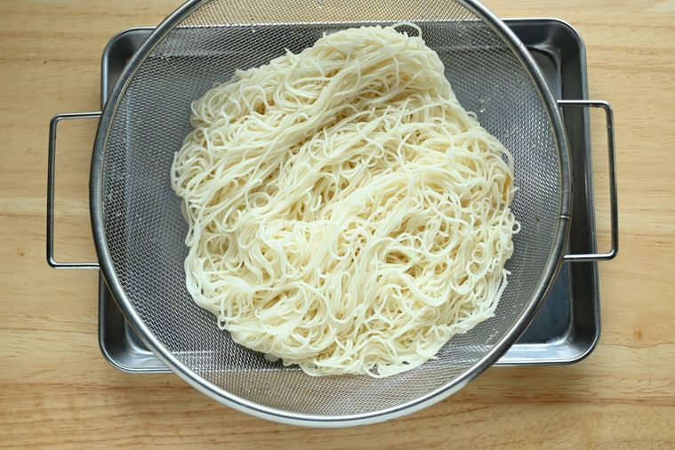 そうめんをゆでて氷水で締め、ザルにあげて水気を切ります。