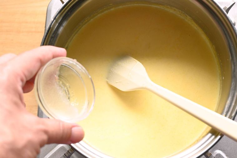 火からおろしてゼラチンを加えて溶かし、ボウルに移します。