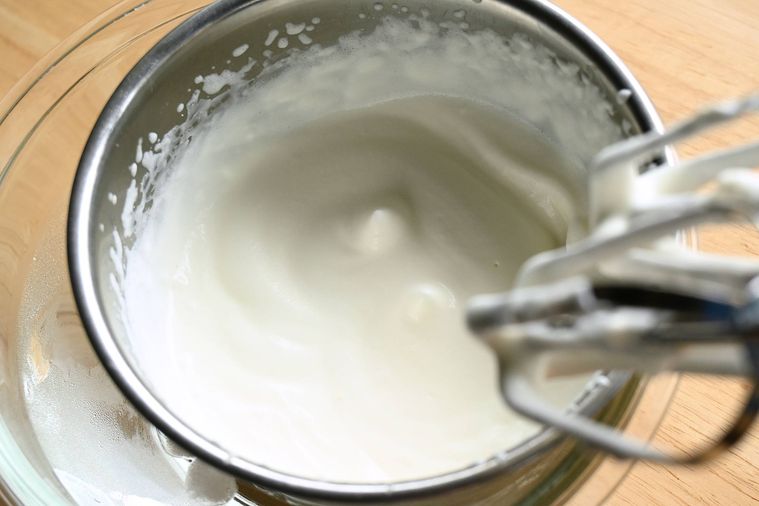 とろみがついてきたら生クリームを2回にわけて加えます。1回目はしっかりめに混ぜて2回目はさっくりと切るように混ぜてなじませます。