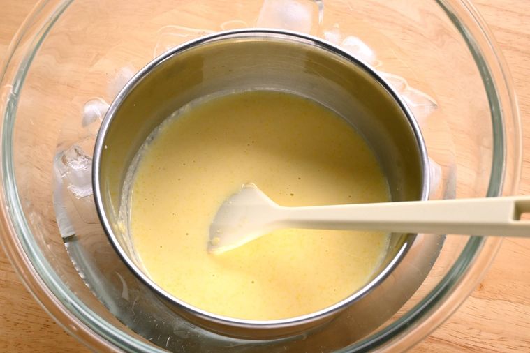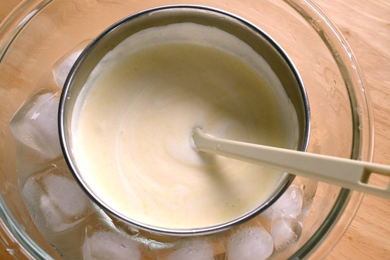 3のボウルの底を氷水に当て、時折かきまぜながらとろみがつくまで冷まします。