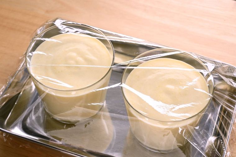 5を器に流し入れ、ラップをかけて冷蔵庫で2~3時間ほど冷やして固めます。