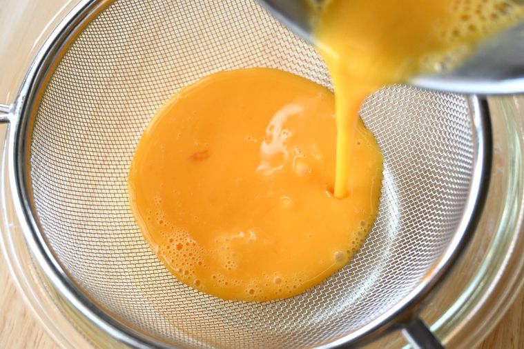 溶き卵をストレーナー(こし器)で濾しながら加えます。