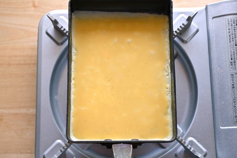 卵液を再度かき混ぜて空いたところに卵液を注ぎ入れ、焼けた卵の下にも流し入れます。