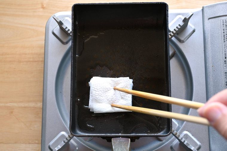 卵焼き器を中火にかけ、サラダ油を入れます。キッチンペーパーで側面も含め、全体にまんべんなく油をのばしてなじませます。