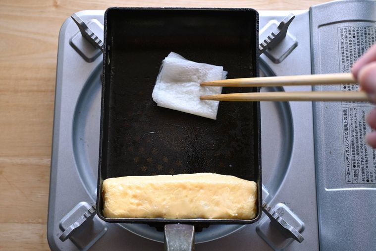 卵液が半熟程度に固まり始めたら、奥から手前に向けて卵を折りたたむように巻いて形を整えます。空いたところにキッチンペーパーで油をひきつつ卵を奥に移動させ、手前にも油をひきます。