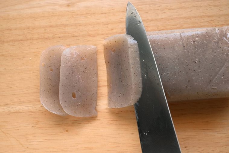 こんにゃくは幅5mm程度のそぎ切りにします。