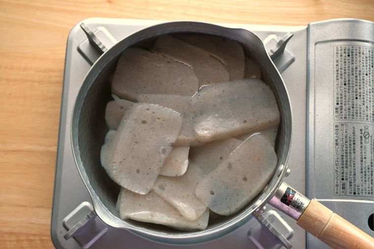 鍋にこんにゃくとかぶるくらいの水を入れて火にかけ、沸騰したら2分ほど煮立てます。