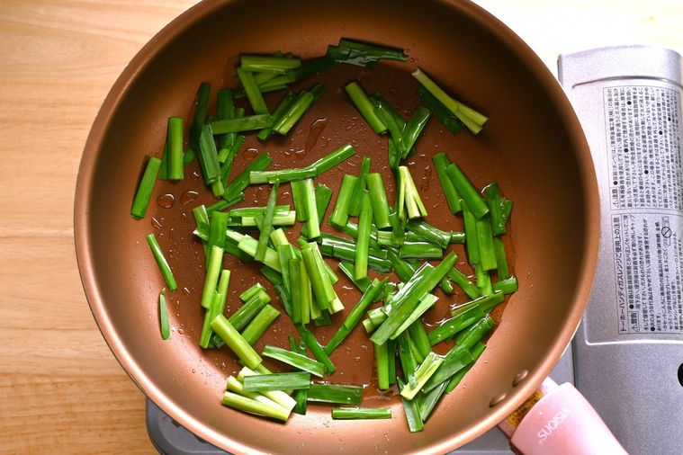 熱したフライパンにごま油をひいてニラを入れ、サッと炒めて取り出します。