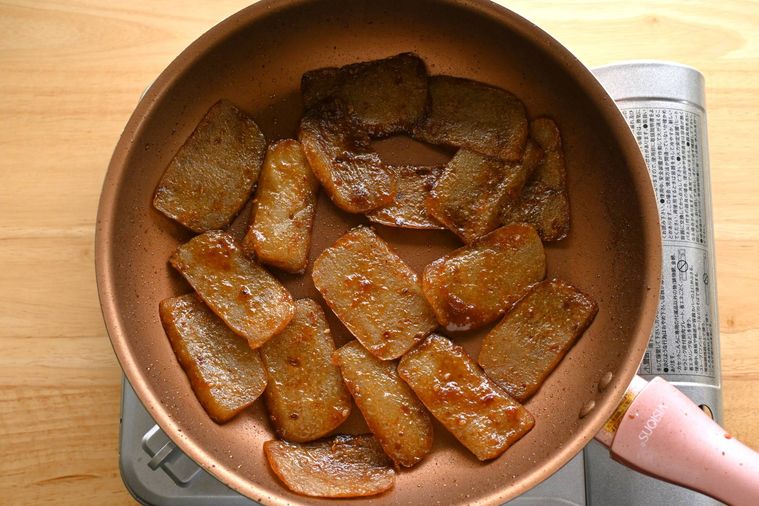 フライパンにこんにゃくを並べ入れて両面を焼きます。