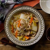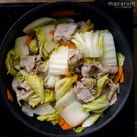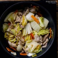 フライパンにごま油を熱し、豚バラ、白菜、にんじんを入れて油が回るまで炒めます。
