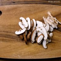 しいたけは石づきを取り、かさと軸を切り離して、どちらも薄切りにします。