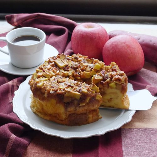 食パンで作るから、手軽な材料で作れて特別な道具もいりません。卵液がじゅわっと染み込んだパンと、ゴロゴロ角切りのりんごとさつまいものハーモニーは絶品です。シナモンの風味がおいしさを引き立てます。ティータイムにぴったりです。