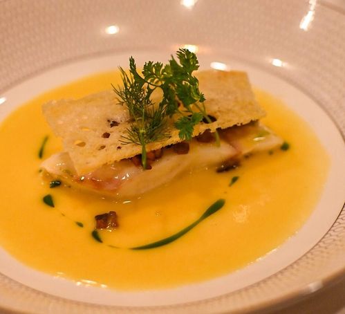 前菜「白レバーのフォンダン リードヴォーと栗」は、フォンダン仕立てにした白レバーと、フランス料理で高級食材として珍重される牛の希少部位「リードヴォー(シビレ)」を、秋の味覚である栗、いちじくと合わせたひと品。
