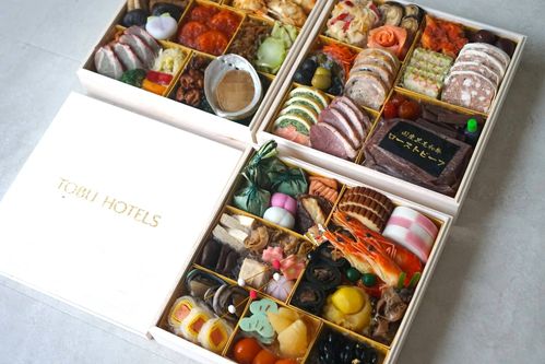 | 壱の重:日本料理 | 海老旨煮、鰊昆布巻、数の子醤油漬け、小城麩、銀鮭柚庵焼、紅白花型餅、黒むつ西京焼、高野豆腐含め煮、巻ゆば味付け、手まり餅、伊達巻など、計25品 |