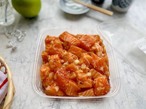 ひと口大の食べやすいサイズにカットされたサーモンがたっぷり。調味料がしっかり絡み、見るからにおいしそうなテリと、広がるごま油の香りが食欲をそそります。