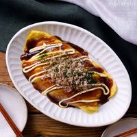 包むように折りたたみ、皿にのせてソース、マヨネーズ、かつおぶし、青のりをトッピングして完成です。